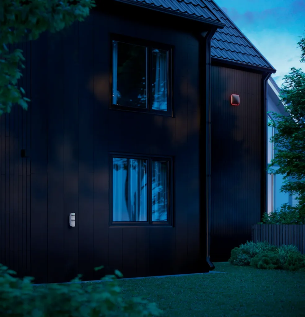 Sirena exterior potente (hasta 113 dB) con luz de alarma y avisos de armado/desarmado. Resistente a la intemperie (IP55), batería de larga duración u opción 12 V, instalación rápida y placa frontal personalizada.